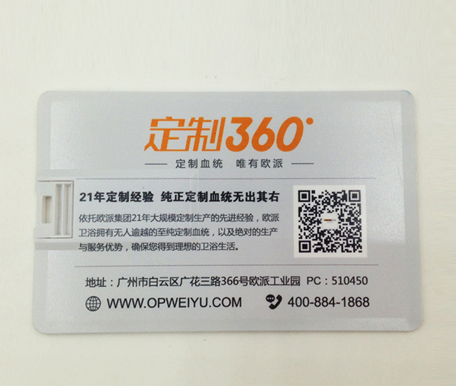 歐派家具集團定制的卡片U盤,歐派家居集團,是中國整體櫥柜行業的領先品牌,擁有國際化家居產品制造基地,極具競爭力的生產規模。卡片禮品U盤適合不同的行業,無論你是什么行業都可以作為禮品來贈送!卡片U盤大小如一張名片一般,所以也叫名片U盤,可以隨身攜帶放在錢包或者名片夾中,LOGO印刷面積大,用戶使用頻率高,十分適合作為一款禮品U盤,廣告性極強!