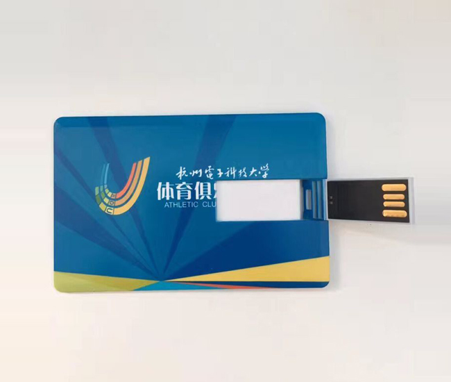 超薄名片U盤 杭州電子科技大學體育俱樂部聯盟定做卡片U盤禮品,作為推廣宣傳校園體育活動禮品,超薄卡片U盤是ABS材料制成,外觀和標準銀行卡一樣,攜帶方便,卡片U盤因為可以印刷各種精美彩色圖案而成為優秀的廣告載體,成為電子禮品業的首選。杭州電子科技大學在深圳U盤廠家定制的這一批名片U盤,名片上面還印制了logo及標志,外觀大小和銀行卡的標準大小一樣,而且還具有防水功能。